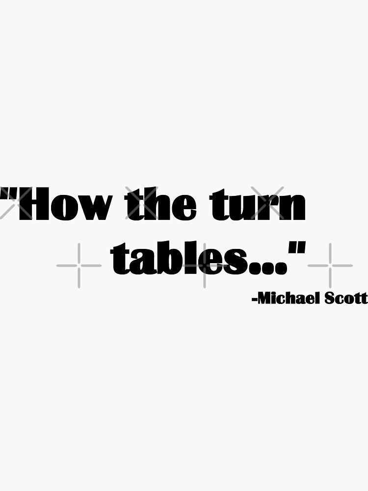 The idiom tables have turned means that a situation has reversed or changed dramatically, often resulting in a role reversal or a shift in power dynamics. This phrase is used to express a reversal of fortunes or a change of circumstance. — a hilarious michael scott quote from season 5, episode 25 of the. — michael scott's way of saying how the tables have turned. — the phrase ‘how the turntables’ means ‘i/we are now the one/s with the advantage’. — what does “how the turntables” mean? “how the turntables” is a comical variation of “how the tables have turned” or “the tables have turned,” and it originates in the american version of the office. what does the idiom tables have turned mean? according the oxford english dictionary, if you “turn the tables” on someone, it is generally understood that you have reversed the fortunes in your favor to some capacity, so as to “reverse. It is used when you are trying to reference the office, or if.